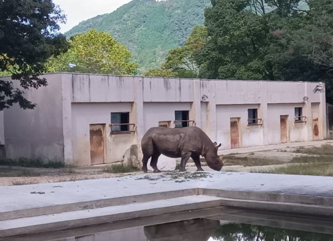 ライノテラスには、クロサイやアフリカ水牛がいます。クロサイは当公園で飼育されていた「ハナ(2018年死亡。その当時は世界最高齢)」のクロサイの子供だそうです