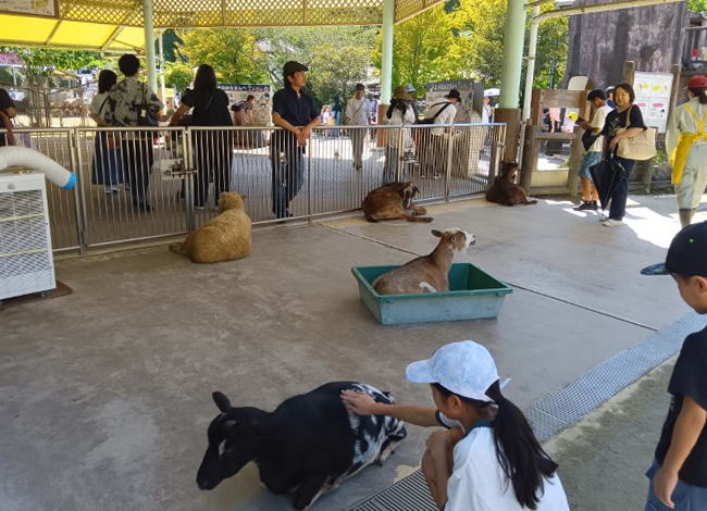 ヒツジ、ヤギ、ブタなどと来園者が直接触れ合いができるピーチくぱーちくのわくわく広場。ほかにクジャクやポニー、ウサギ、インコなどいます