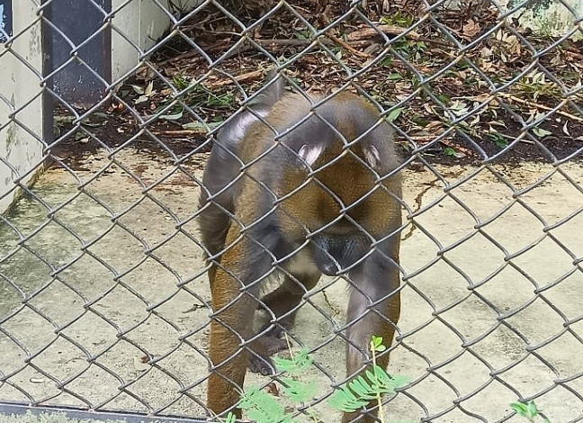 雌のマンドリル(アサマル)。隣り合わせの宿舎にいるシンゴ(雄)は繁殖のため豊橋総合動植物公園からやってきたそうです