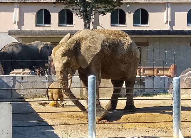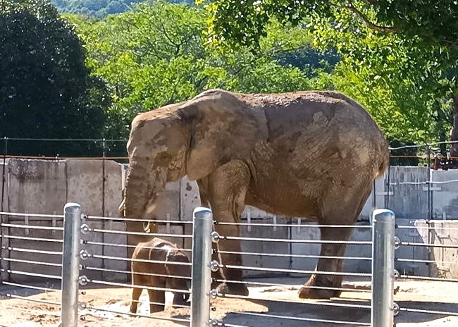 赤ちゃんゾウ(雄)と母親のメイ(推定26歳)の一般公開が9月17から開始されました。お母さんと一緒に屋外の運動場で母親の回りで遊ぶ姿に、来園者から「かわいい」の歓声があがります。誕生してほぼ2か月、思ったいたより小さく見えます