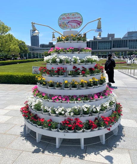 FF(フラワーフェスティバル)のシンボル「花の塔」はカーネーションやペチュニアなど約8,000鉢で装飾され、期間中は塔の先端に「平和の灯」がともります