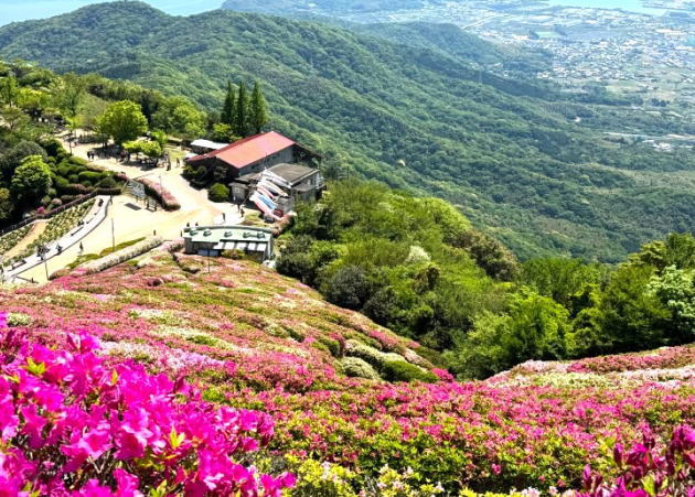 防府市にある標高631mの大平山の山頂に整備された公園で、10万本のつつじが咲き誇る西日本有数のツツジの名所として知られています。公園からは瀬戸内海を臨むパノラマ絶景が広がり、市街地や瀬戸内海の島々が望めます