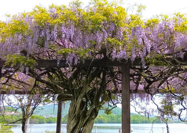 180本あまりの藤の木が幅6メートルに渡り貯水池沿いに植えられています。藤棚の下には立ち入れないのですが、湖のほとりで優雅に咲く藤を見ることができます