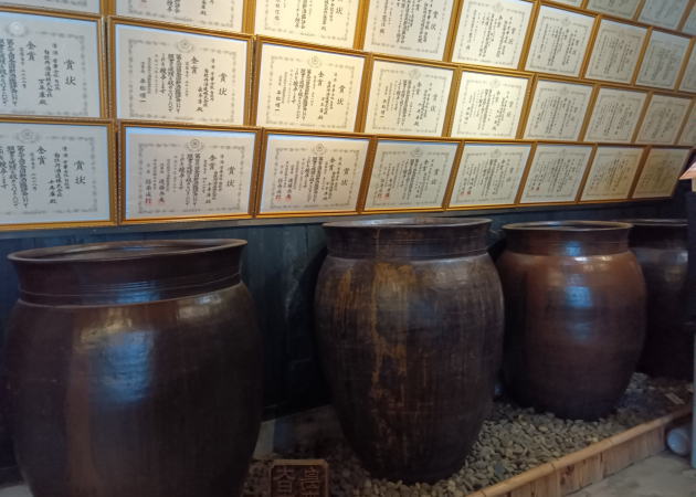 見学室の壁には全国新酒鑑評会金賞の賞状が壁一面に飾られています。また試飲サーバーによる試飲ができその時期お勧めのお酒を100円で1~2銘柄試飲ができます。この時期のお勧めは広系酒44号&45号を使用し試験醸造した純米吟醸酒です。女性でも飲みやすく甘口のお酒でした