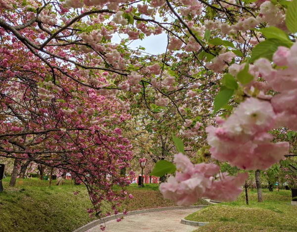 普段見かけないような品種が多数咲いています。八重桜のボリューム満点の花弁は豪華で華やかです。これだけの種類と本数の桜が咲き誇る桜の花道は、見事で本当に綺麗でした (2022年4月15日)