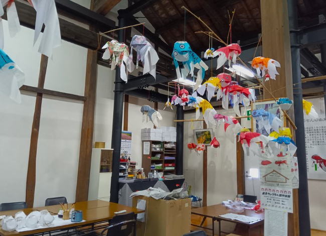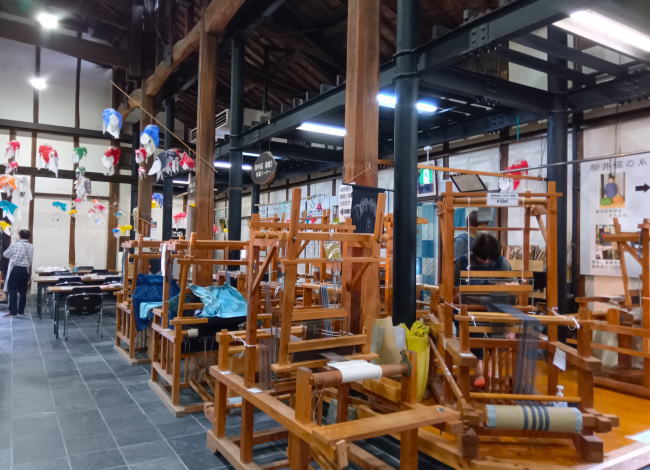 金魚の形をしたユニークなちょうちんに目や胴体に柄をいれ、ひれやしっぽとつけていく工程や、織機を使って柳井縞のコースターを織っていくなどの楽しい体験ができます