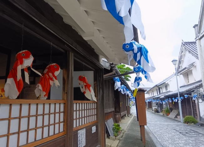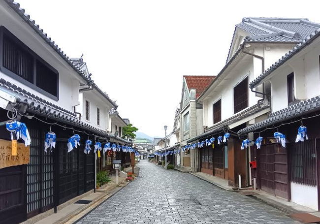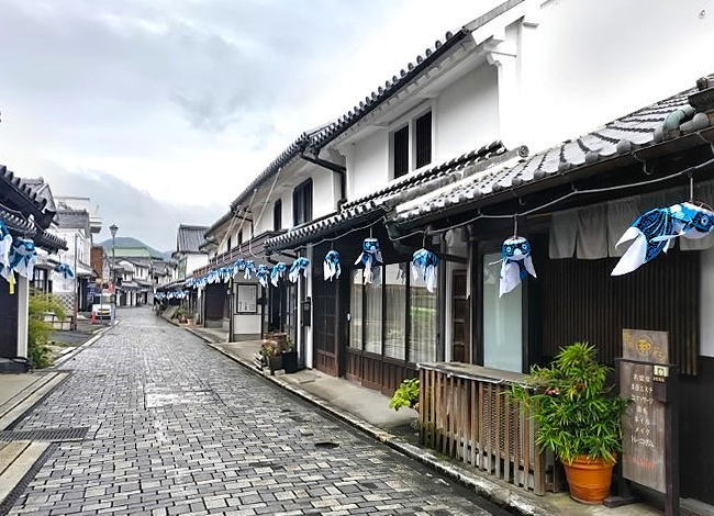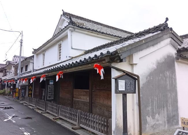 約200mの街路の両側には、江戸時代の商家の町並みが続き国の重要伝統的建物群保存地区に選定されました。往時の豪商の屋敷跡や元油商の大きな町家など当時の面影がしのばれる安らぐ建物が軒を連ねています