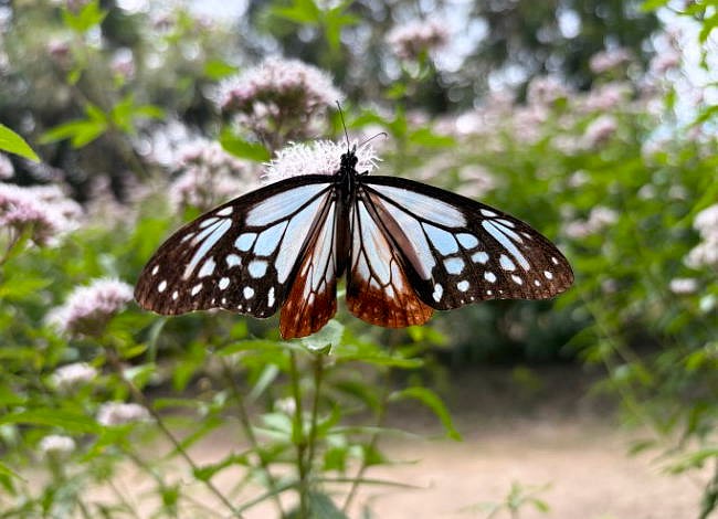 タテハチョウの仲間で黒や茶の縁取りに淡いブルーの模様が鮮やかな羽を持ち、羽を広げると10センチほどになる大型の蝶です