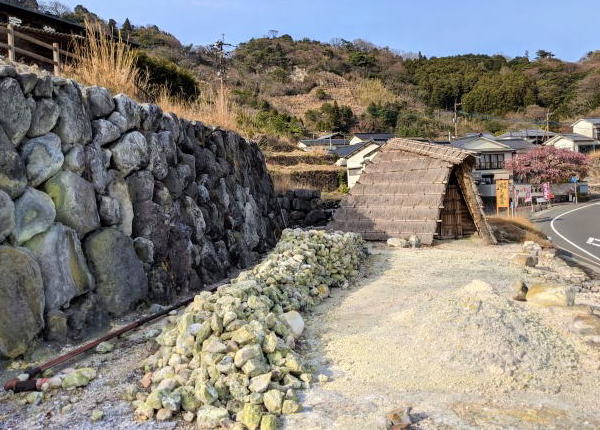 明礬温泉は江戸時代湯の花を採取したことで誕生した温泉街で、名物である「湯の花」を製造している藁葺きの 湯の花小屋 が点在しています。作られた湯の花(ゆのはな)は、一般に入浴剤として販売されています