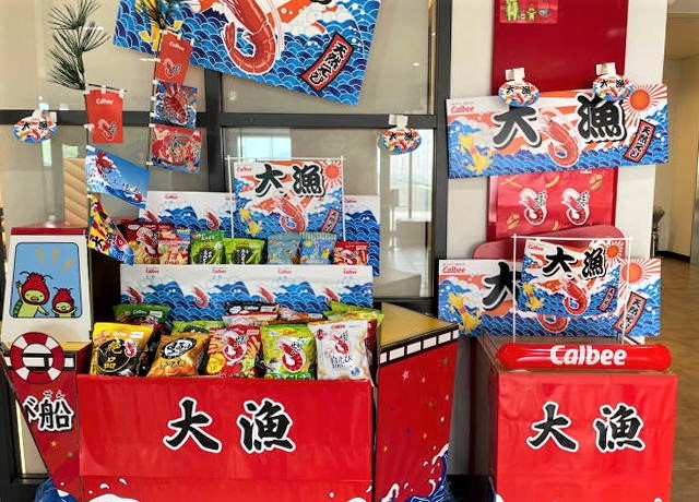期間限定商品の「フレンチサラダ味」富山県産の白エビで作られた「かっぱえびせん白えび」やビールにあう花藻塩と燻製の唐辛子を使った「絶品」などの珍しい商品が並んでいます