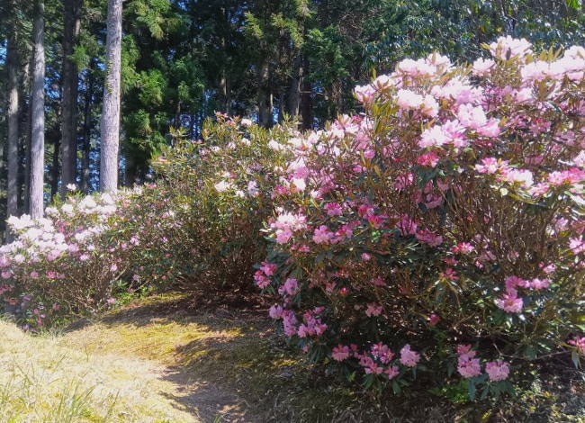 アカマツの木々の間、山の斜面に多く花をつけています。シャクナゲロードは下草も刈られ綺麗に整備されています