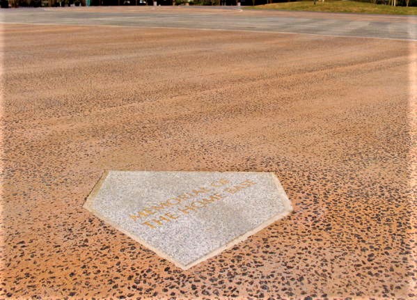 スケートボード場近くには、かって同じ場所にあったームベースが原寸大で設置されており、離れた場所にはピッチャーマウンドも埋められていて旧市民球場の名残りを感じられます。また右塁席を再利用したベンチは、カープフアンの憩いの場所にもなっています