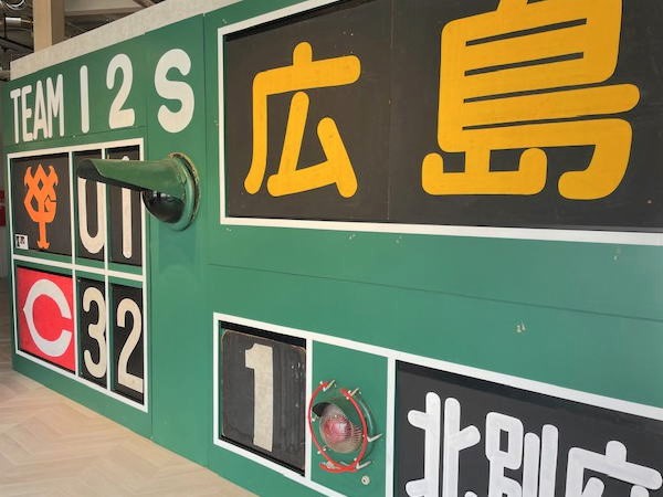 旧市民球場にあった実物の一部を再現したスコアボードや歴代のカープのユニホームがずらーと並んでいます。かっての名選手だった山本浩二さんや衣笠祥雄さんのユニホームやバット、グラブ、サインボールなどが展示されています