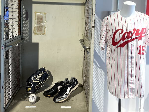 カープ元選手の黒田博樹さんが市民球場時代に使っていたロッカールームとユニホーム。球場完成やリーグ優勝、最後の公式戦などを紹介した年表コーナーなどもあります