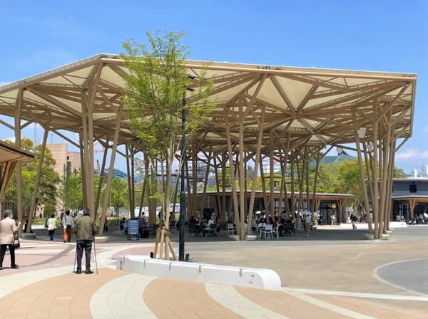 折り鶴がモチーフの「大屋根ひろば」。屋根の高さは約8.8mもあり、テイクアウトした料理を食べたり、お喋りしたり、のんびりくつろげるスペースです。周りにはスターバックスやハワイアンレストラン「Eggs'n Things (エッグスンシングス)」の店舗があり、広島初上陸で話題のEggs'n Things には長い行列ができています。パンケーキが人気だそうです