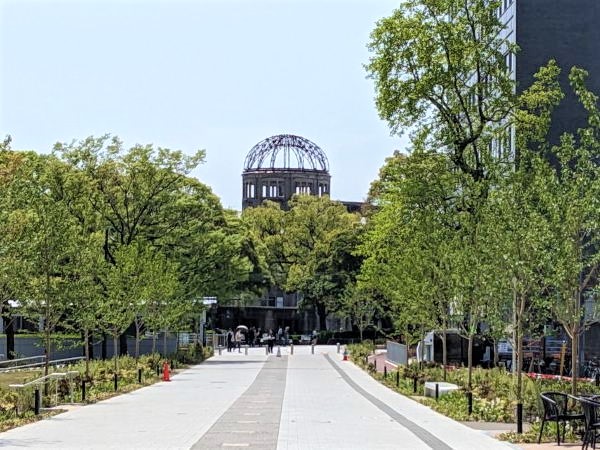 全長約190mの桜並木の散歩道「ピースプロムナード」からは、直線状に原爆ドームが見えます。道の中央に敷き詰められた敷石は、路面電車の被曝敷石を使用しているようで、平和であることがが実感できる散歩道です