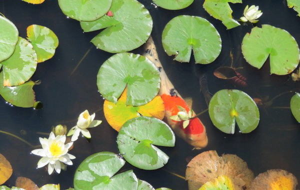 鯉は足音がすると餌をもらいに寄ってきます。亀もいます