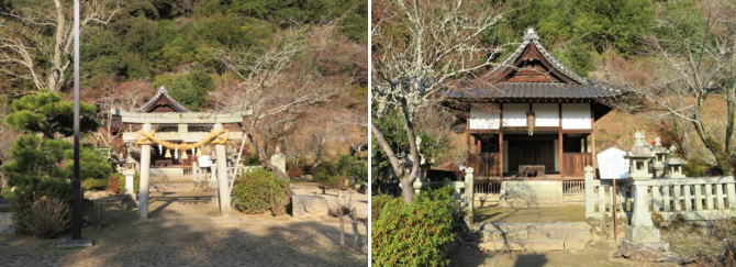 吉川家の死節の臣をまつる小さな神社で一般的にはあまり知られていなくて参拝する人を見かけることは滅多にありません。賽銭箱の前には猫が昼寝をしていました。二つ目の鳥居と本殿