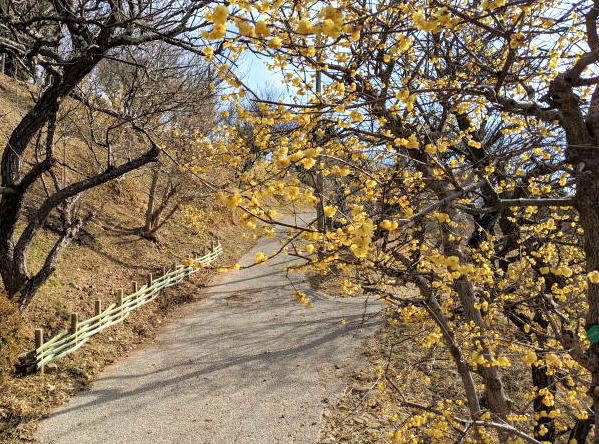 光市にある梅の里・冠山総合公園で蝋梅が見頃を迎えています。約60本ほど蝋梅の木があるそうですが、天候の影響かそんなに多く花をつけてはいませんでした。ロウ細工のような黄色い花を咲かせる、中国原産の落葉低木で寒くて花の少ない時期に咲き、ほのかにいい香りのするやさしい花です