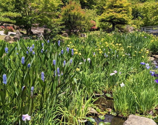 せせらぎ水路に咲き誇る菖蒲と日本庭園はしっとりと和の風情が感じられます。花菖蒲は8割がた黄菖蒲が多く見られます。もう少し色とりどりに咲くと一段と美しく感じられるような気がします