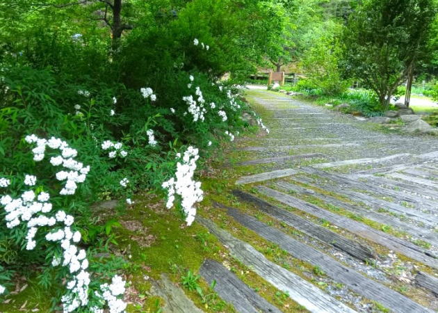 いろいろある草花の中で苔とのコラボが素敵で、糸のような穂を付け草花が気になりオーナーの奥様に伺ったところ、「白糸草」という山野草で、ご主人も好きな山野草のようです。白く長い穂状の花が風に揺れる姿は幻想的です