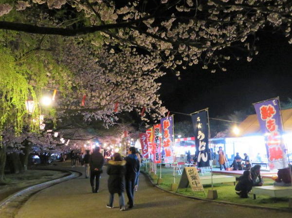 日没~ 22:00まで夜間の錦帯橋ライトアップを実施。昼間とは違って幻想的な光景が見れるとあって日中よりたくさんの花見客で賑わっています