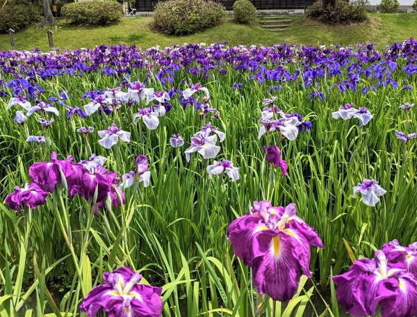 こちらは 吉香菖蒲園 。50品種約10万本のハナショウブが掘割を埋め尽くすように綺麗に整列して咲いています。ショウブの開花に合わせて開催される「錦帯橋花菖蒲まつり」は昨年に続き今年も中止となりました