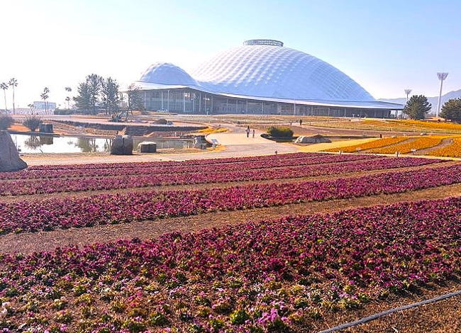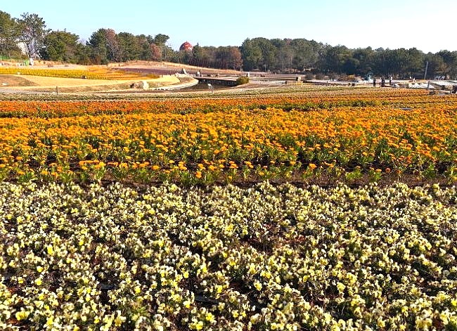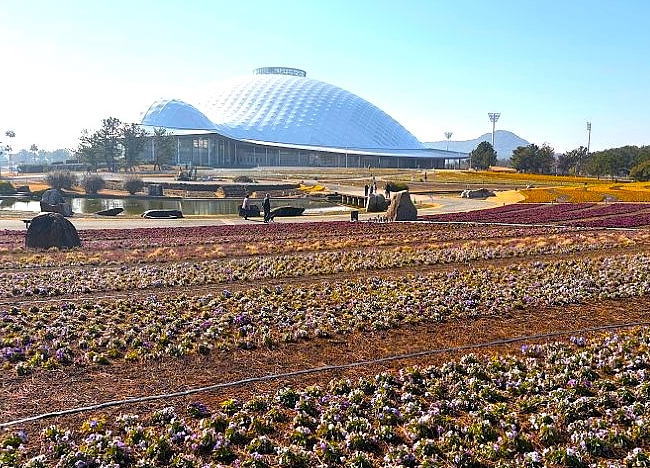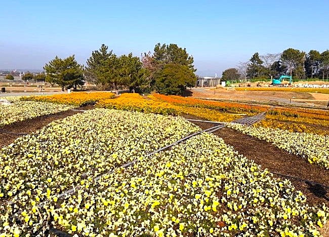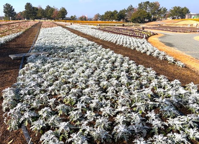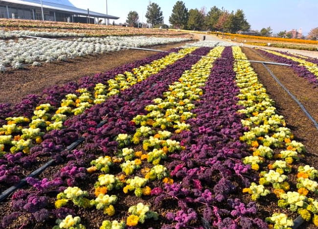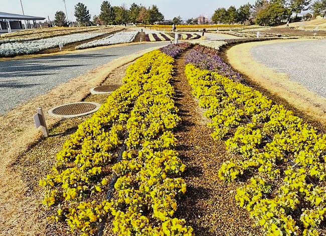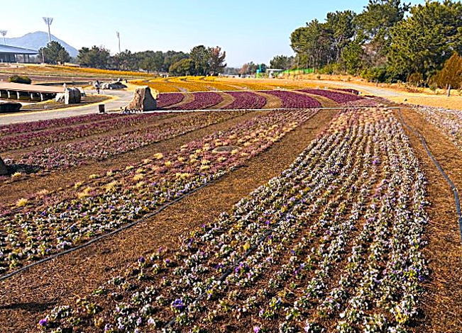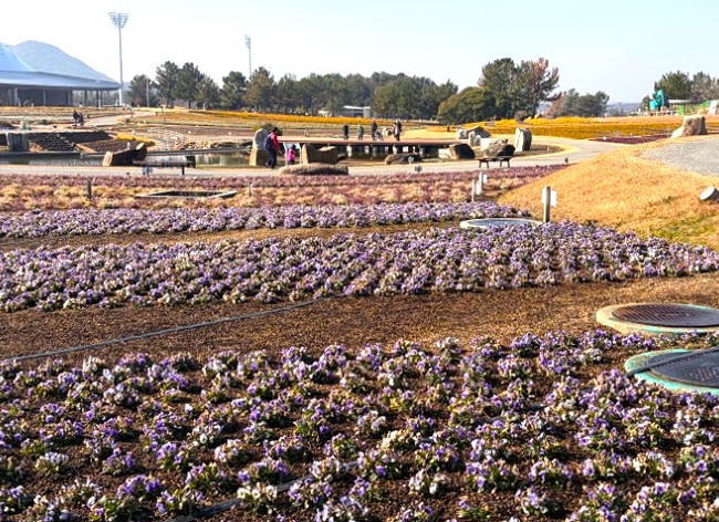 山口きらら博記念公園のフラワーガーデンが冬の花にリニューアルしました。パンジー、ビオラなど12月から4月にかけて見頃を迎える9種類、12万株の新しい花に植え替えられました