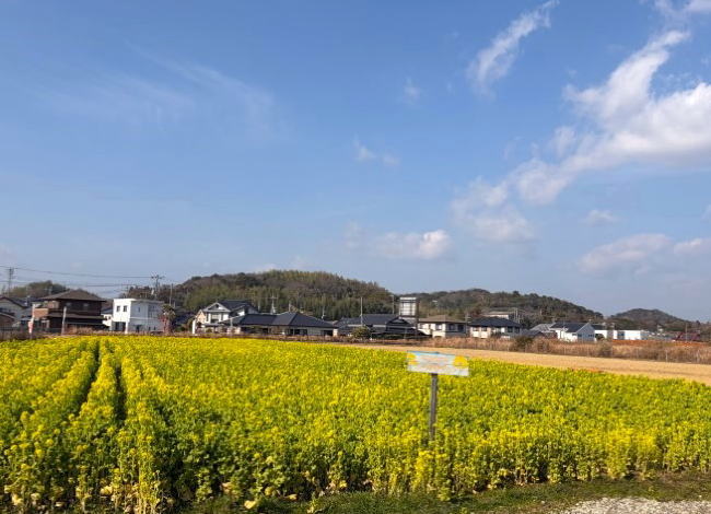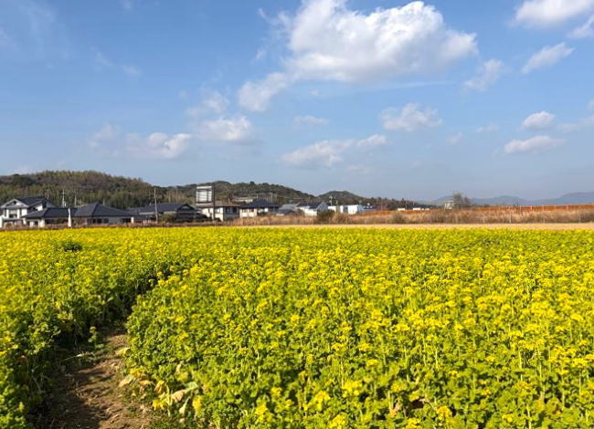 近くにある「道の駅 きららあじす」では、20万本菜の花が見頃を迎えていました。畑一面に広がる黄色の〝じゅうたんと青い空のコントラストを楽しめます。春は「菜の花」、夏は「ひまわり」、秋は「コスモス」が咲く「花の駅」としても知られています (2026年1月17日)