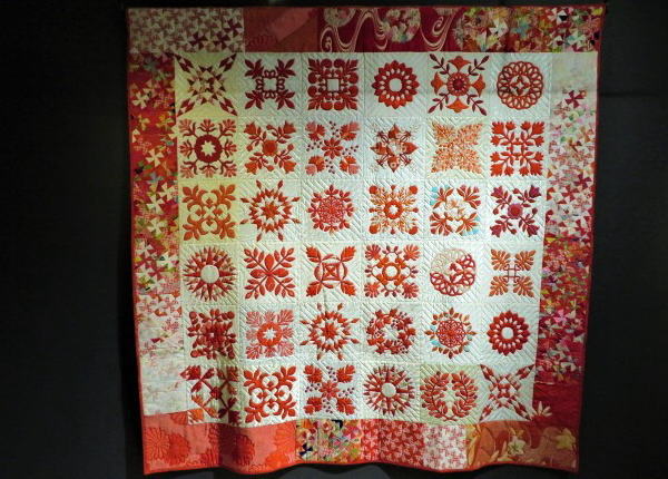 30人のトップキルターさん達の力強い作品の数々にすっかり感動しました。今回は和布を中心にした作品が多く昨年とは違った雰囲気でとても良かったと思いました。新型コロナの影響なのか出展数は少なかったようですが、充実した大作ばかりで今後の作品作りの参考になりました。最終日は混雑しているだろうと思い出かけたのですがことのほか少なく時間のたつのも忘れ鑑賞できました