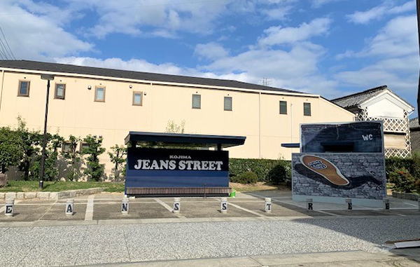 ジーンズストリート内にあるジーンズ型トイレとベンチを備えた休憩所