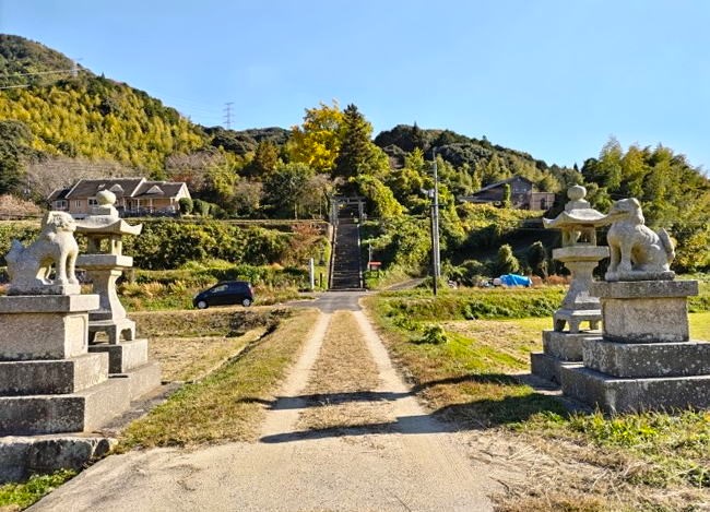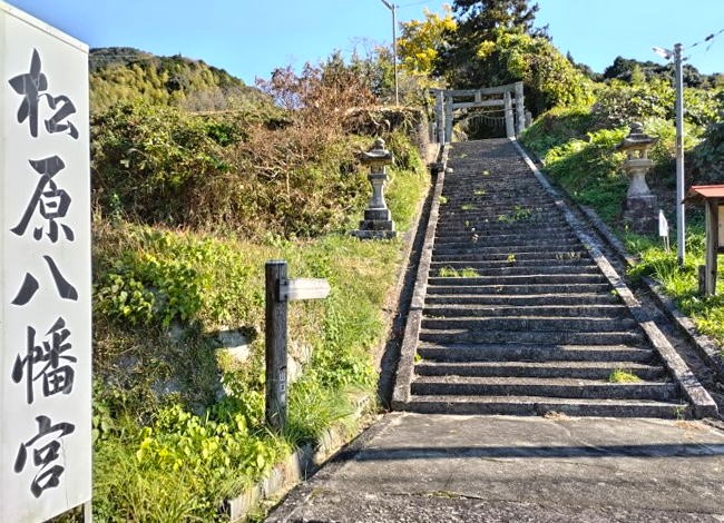 三丘温泉に向かう県道144を走っていると畑のなかに左右向かい合う狛犬、山側には鳥居が見えてきます。前を通るたびに気になっていたので寄ってみることにしました。松原八幡宮への長い参道です