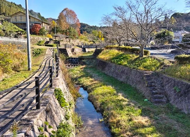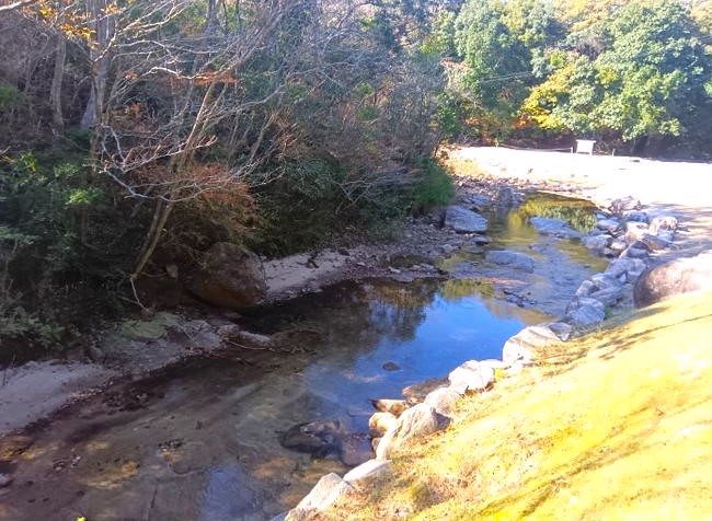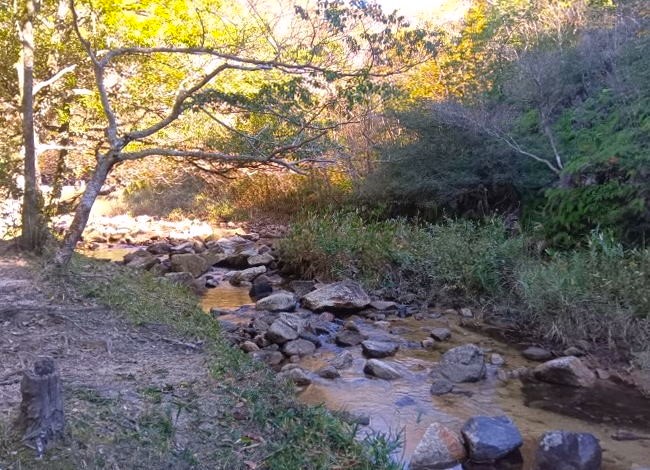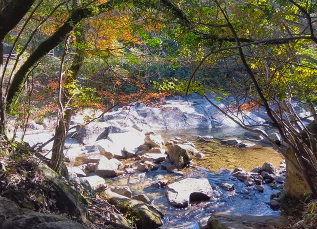清流の中に大小様々な黒い花崗岩質岩石が並ぶ清らかな渓流が続いています。黒岩川は石城山県立自然公園内のあり、静かな渓谷で川辺でのんびり過ごすのには最適です