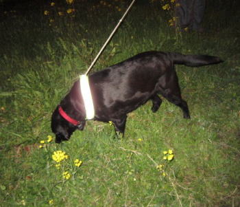@夜道は暗いから、ちゃんと安全ベルトをして散歩してます。桜が咲いている街区公園を通リ抜けます