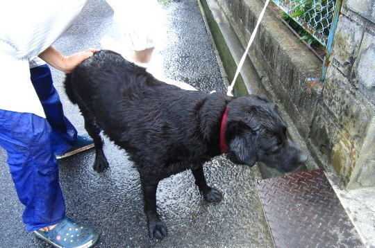 我が家で一番乗りの入浴をした後は、よく砂を洗い流し、何度も拭き(オブタサンだから拭くのが大変!2人がかりで自分達の汗をふきふき頑張っています)