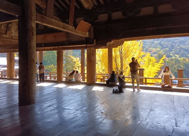 「豊国神社(千畳閣)」は、豊臣秀吉が安国寺恵瓊に命じて建立させた大経堂で、ほぼ千畳分の広さほどあることから俗に千畳閣と呼ばれて親しまれています。堂内から眺めるとイチョウに陽があたり黄金色に輝きとてもキレイです