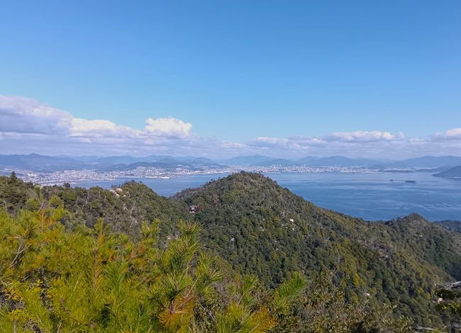 「獅子岩駅」そばにある「獅子岩駅展望台」からからの景色!天気の良い日は四国までも見渡せることがあるそうです。「獅子岩駅」正面にそびえる山が「弥山」。弥山山頂まで約30分(案内板によると)ほどの登山を楽しんできます