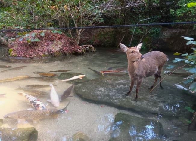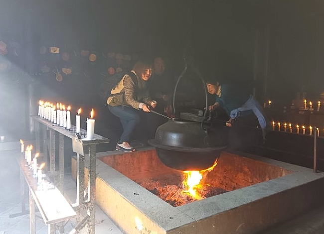 弥山本堂の前の「霊火堂」には、公法大使がともして以来消えることなく燃え続けている「消えずの火」。この火にかけられている大茶釜で沸かした霊水は万病に効くと言われ自由に飲むことができます