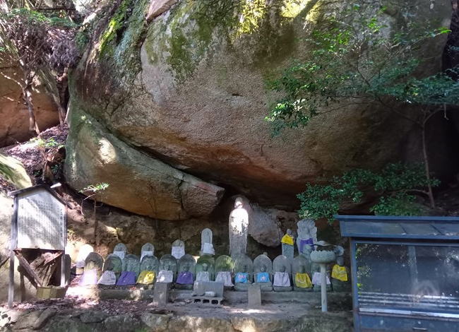 弥山山頂への少し手前に巨大な岩のトンネル「くぐり岩」があります。花崗岩が風化して生まれた奇岩で何百万年という年月をかけ自然が生み出す圧倒的なパワーに神秘的なものをを感じます。さまざまな形状をした岩が重なり、下には石造りのお地蔵さまが何体も並んでいます