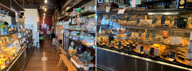 旬の野菜、果物など三次の食材をふんだんに使ったオリジナルパンが並んでいます。奥はカフェになっていて焼立てののパンやランチもいただます。所狭しと雑貨や洋服なども並んでいます。個性あふれるパンが沢山あり何種類かのパンを購入して帰りました