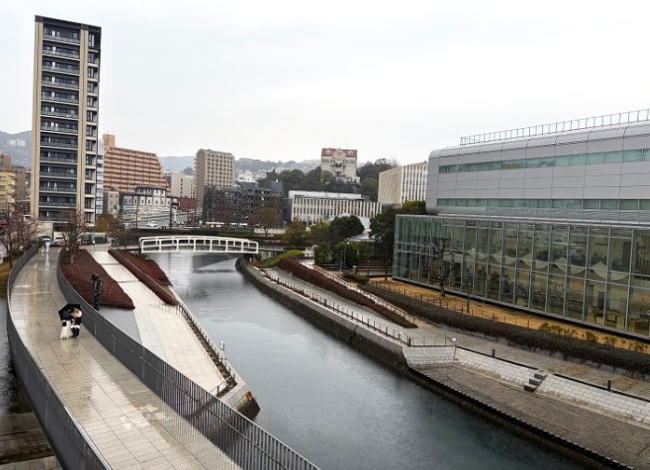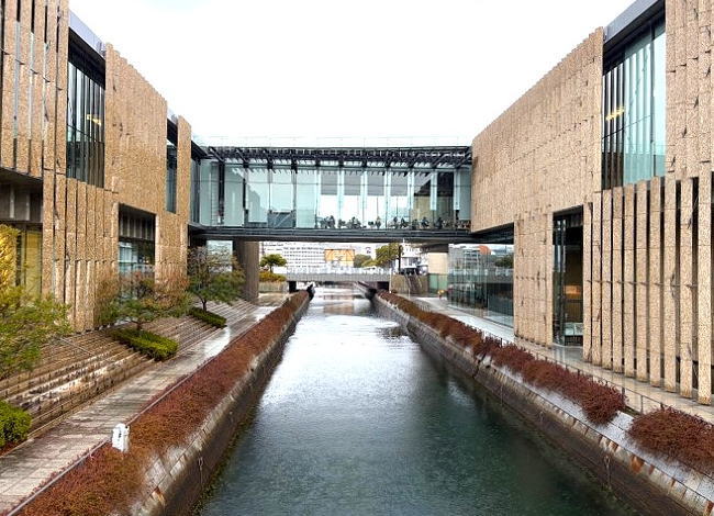 運河を挟んで、スペイン美術や長崎ゆかりの美術を展示する美術館棟と、ミュージアムショップや情報コーナーなどがあるギャラリー棟の2棟が建つ!