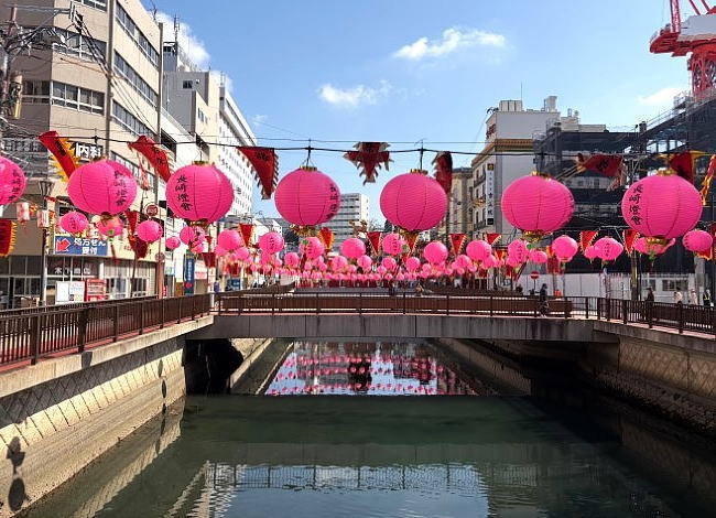 長崎新地中華街の北門の前を流れる銅座川には桃色のランタン。優しく愛らしい雰囲気になっています