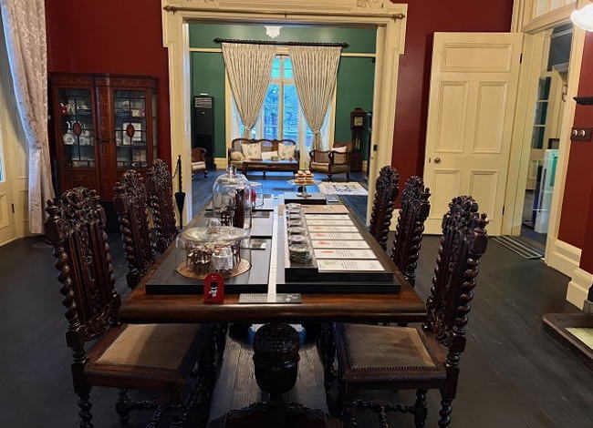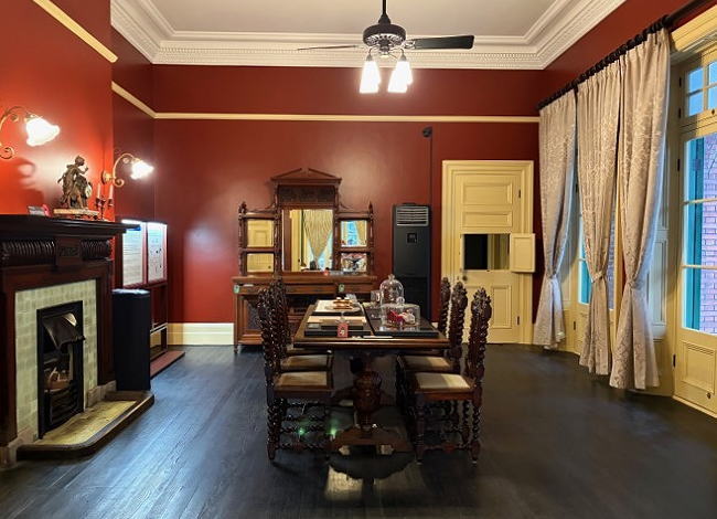 応接室から続く「食堂」は来客のおもてなしにも使われていた部屋。深い赤い色の壁で応接室とは雰囲気ががらりと変わる居留地時代の長崎の異国文化が残る貴重な建造物で、内部は当時のイギリスの雰囲気が漂い居留地時代にタイムリップしたようです