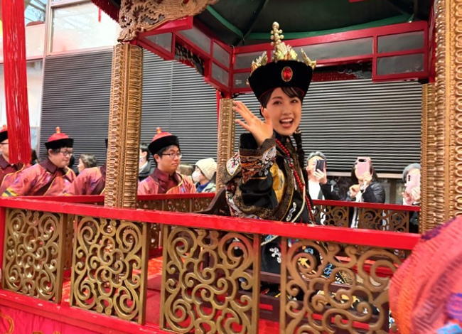 14時から行われた皇帝パレード。皇帝・皇后御興を中心に旗隊など総勢100名が豪華な中国衣装を身にまとって中央公園などの市内をパレードします。雨模様のためコース変更、短縮して行われました