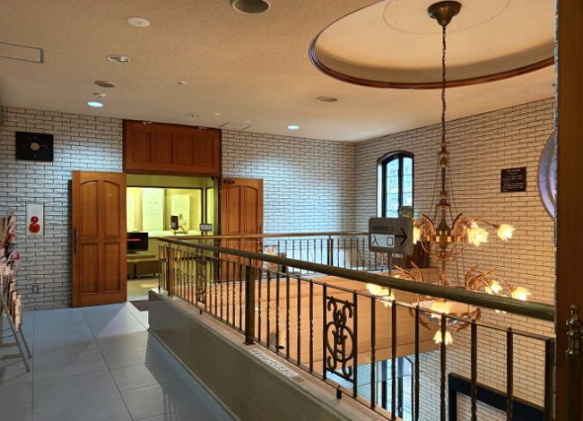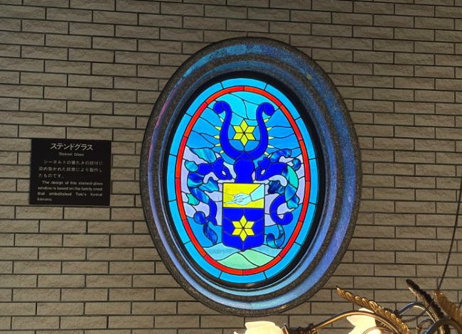 壁面にはシーボルト家の紋章がレリーフとステンドグラスに表現されていて、その紋章の中央には医者の家系だけにメスを持つ手が施されています。展示室は撮影禁止となっています