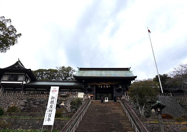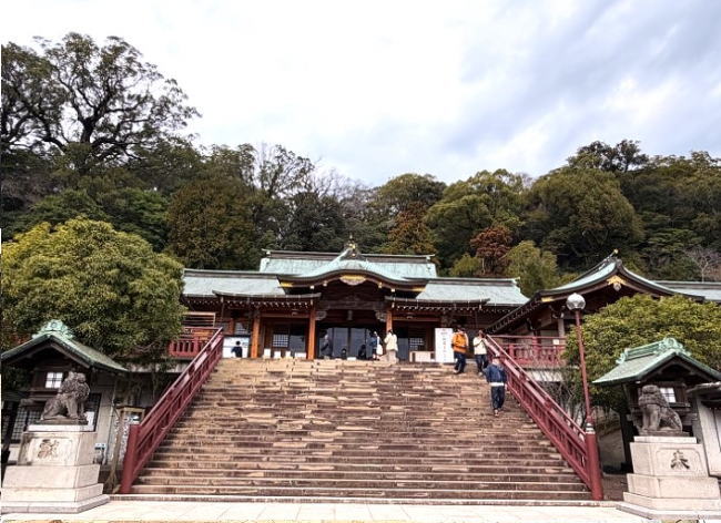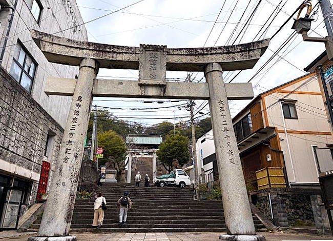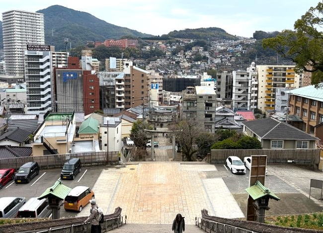 5つの鳥居と、194段もの石段の先には大門。大門からは坂の町・長崎らしい景色が広がっています