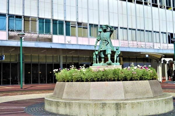 JR岡山駅東口に建つ桃太郎像。桃太郎がお供の猿、雉、犬を連れて遠くを眺めているような表情の像です。隣りにはネギ坊主のような形をした大きな噴水「ピーコック噴水」があります