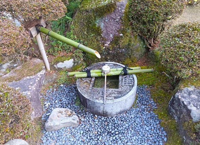 知足の手水鉢。手水鉢の4方の文字と中央の「口」の字を合わせると「吾唯足知」。「吾唯足知」とは現実に不平不満を言わず、感謝し、より前進を誓う言葉だそうです