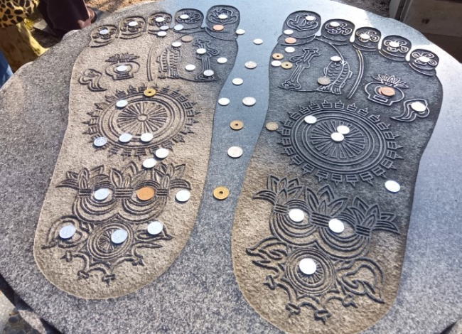 お釈迦様の足の裏を石に彫った仏足石。その日一日の幸せに感謝し、願いながら、足の裏を撫でるとお釈迦様が持つ偉大な徳から、正しい方向へと導いてくださるそうです。本堂内にはパワースポットがたくさんあります
