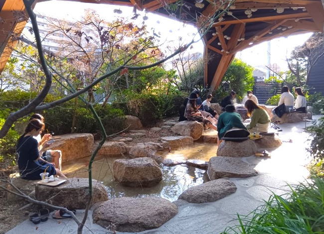 開湯600年と言われる湯田温泉は白狐が傷を癒やしていたのを僧侶が発見したのが始まりなのだとか。施設内は、味わえる地酒や外郎スィーツを味わえる カフェやながら、のんびりと足湯を楽しめる施設です